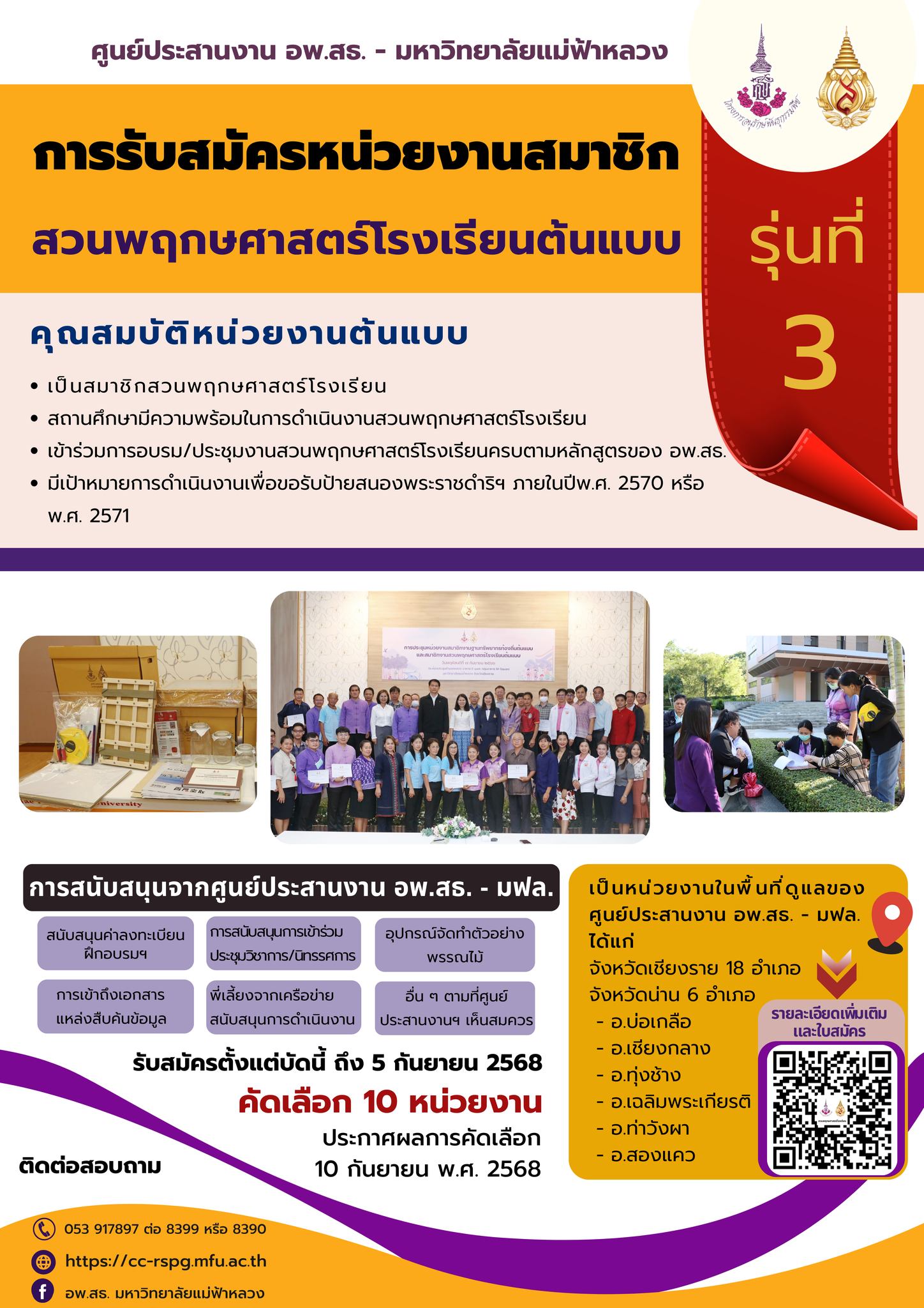 ศูนย์ประสานงาน อพ.สธ. – มฟล. จะประกาศผลการคัดเลือก: วันที่ 10 กันยายน 2568 ทางเพจ อพ.สธ. มหาวิทยาลัยแม่ฟ้าหลวง