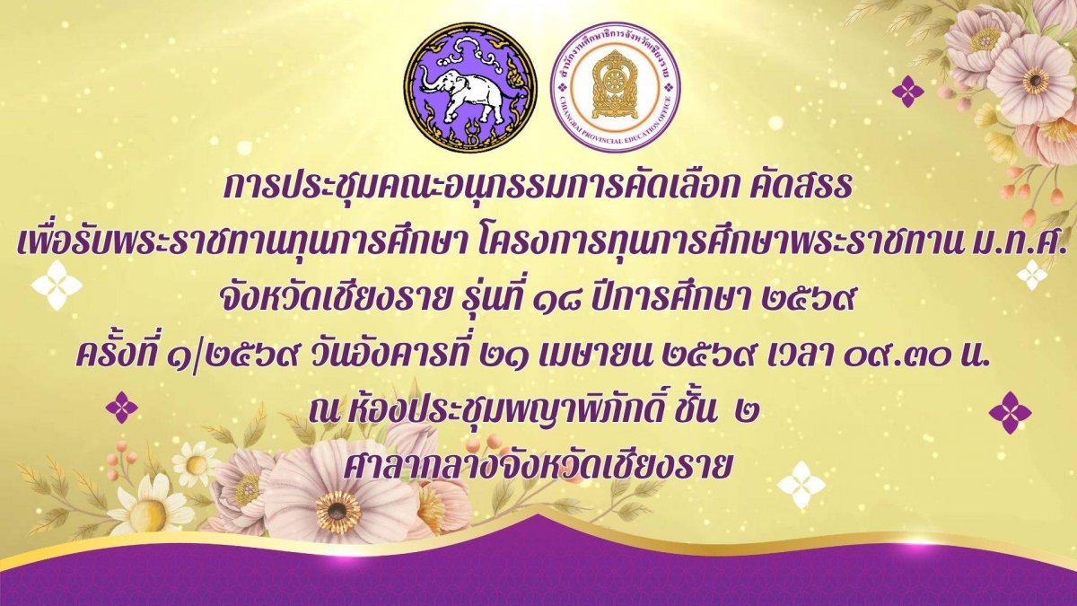 • [27/3/2569] เชิญชวนสถานศึกษาสมัครเข้าร่วมการประกวดเยาวชนต้นแบบด้านมารยาทไทย และมารยาทในสังคม จังหวัดเชียงราย ประจำปีงบประมาณ พ.ศ. ๒๕๖๙