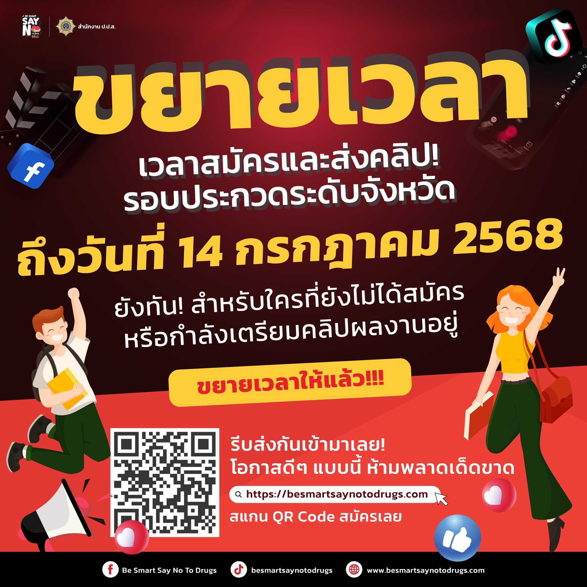 • [4/7/2568] ขยายเวลาการสมัครและส่งผลงานเข้าประกวดโครงการสื่อสาร สร้างสรรค์ รู้เท่าทันยาบ้า (BE SMART SAY NO TO DRUGS) ปีที่ 2