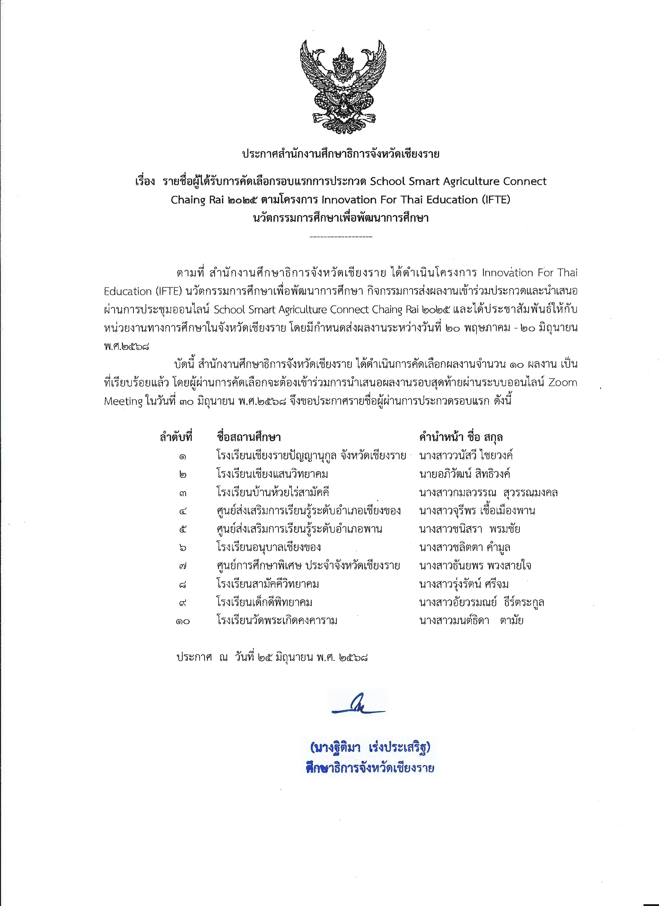 | 12 | รายชื่อผู้ได้รับการคัดเลือกรอบแรก การประกวด School Smart Agriculture Connect Chaing Rai 2025 | - | นายไกรพงษ์ จินดาคำ | 27/6/2568 | |