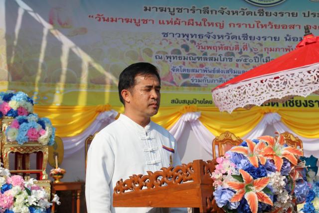 นางฐิติมา เร่งประเสริฐ ศึกษาธิการจังหวัดเชียงราย พร้อมข้าราชการในสังกัด ร่วมพิธี “วันมาฆบูชา แห่ผ้าผืนใหญ่ กราบไหว้ยอสา องค์พระสัมมาสัมพุทธเจ้า” ณ พุทธมณฑลสมโภช 750 ปี อ.เมืองเชียงราย จ.เชียงราย โดยมี นายรุ่งโรจน์ ตันวุฒิ นายอำเภอแม่ลาว เป็นประธานในพิธี จัดโดย สมาพันธ์ส่งเสริมและพิทักษ์พระพุทธศาสนาจังหวัดเชียงราย เพื่อทำหน้าที่พุทธบริษัทในการร่วมกันส่งเสริม พิทักษ์ ปกป้องและธำรงไว้ซึ่งพระพุทธศาสนา อุปถัมภ์บำรุงพระภิกษุสงฆ์ ส่งเสริมสนับสนุนให้เด็ก เยาวชน ศึกษาตามหลักธรรมวินัย และประกาศปฏิญญาให้พระพุทธศาสนาเป็นศาสนาประจำจังหวัดเชียงราย