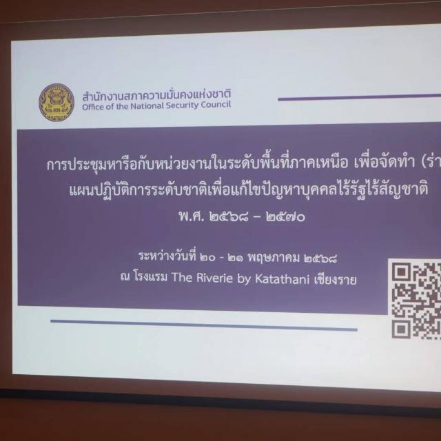 นางฐิติมา เร่งประเสริฐ ศึกษาธิการจังหวัดเชียงราย มอบหมายให้ นางสาวจันทร์แสง พรมสี รองศึกษาธิการจังหวัดเชียงราย และนางสาวอรวรรณ ศรีใจ นักวิชาการศึกษาชำนาญการ เข้าร่วมประชุมหารือกับหน่วยงานในระดับพื้นที่ภาคเหนือเพื่อจัดทำ (ร่าง) แผนปฏิบัติการระดับชาติเพื่อแก้ไขปัญหาบุคคลไร้รัฐไร้สัญชาติ พ.ศ.2568-2567 ณ โรงแรม The Reverie by Katathani โดยมี นายสรพงค์ ศรียานงค์ ที่ปรึกษาด้านการประสานกิจการความมั่นคงรักษาราชการแทนรองเลขาธิการสภาความมั่นคงแห่งชาติเป็นประธาน