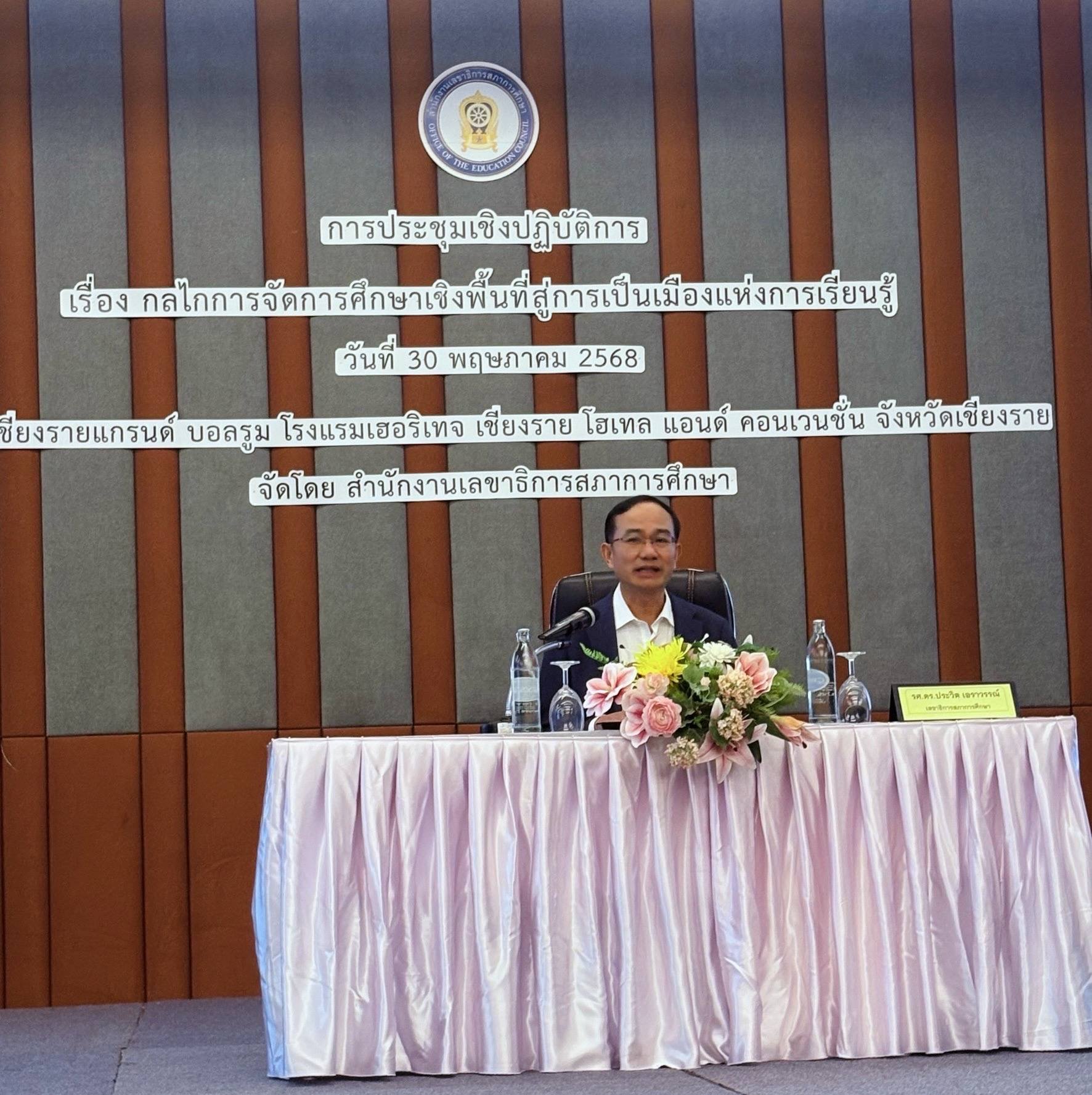 พัฒนาการศึกษา เข้าร่วมประชุมเชิงปฏิบัติการ เรื่อง กลไกการจัดการศึกษาเชิงพื้นที่สู่การเป็นเมืองแห่งการเรียนรู้ ณ ห้องเชียงรายแกรนด์ โรงแรมเฮอริเทจ เชียงราย โฮเทล แอนด์ คอนเวนชั่น จังหวัดเชียงราย ด้านบนเวทีได้มีการอภิปราย โดยมี ดร.นิติ นาชิต รองเลขาธิการสภาการศึกษา นางสาวกิ่งกาญจน์ เมฆา ผู้อำนวยการสำนักนโยบายและแผนการศึกษา ร่วมแลกเปลี่ยนความคิดเห็นกับผู้ทรงคุณวุฒิ และได้ร่วมกันอภิปรายและระดมความคิดเห็นประเด็นกลไกการจัดการศึกษาเชิงพื้นที่ โดย ดร.วัฒนาพร ระงับทุกข์ อดีตรองเลขาธิการคณะกรรมการการศึกษาขั้นพื้นฐาน นางฐิติมา เร่งประเสริฐ ศึกษาธิการจังหวัดเชียงราย นายจักรพงษ์ แสงบุญ หัวหน้าฝ่ายแผนงานและงบประมาณกองยุทธศาสตร์และงบประมาณ เทศบาลนครเชียงราย ผศ.ดร.ศิวภรณ์ สองแสน ผู้อำนวยการสถาบันการเรียนรู้ตลอดชีวิต มหาวิทยาลัยราชภัฏเชียงราย และดร.อนุรัตน์ อินทร ประธานอาวุโสหอการค้าจังหวัดเชียงราย ร่วมถอดบทเรียนการจัดการศึกษาและกิจกรรมด้านการศึกษาของประเทศต่าง ๆ ที่เป็นสมาชิกเมืองแห่งการเรียนรู้ของ ยูเนสโก พร้อมทั้งร่วมแลกเปลี่ยนเกี่ยวกับแนวทางการดำเนินงานของเชียงรายที่มุ่งเน้นความต้องการของคนในพื้นที่และความต้องการของตลาดแรงงาน โดยไม่ลืมจุดเด่นด้านวัฒนธรรมของตน สำหรับปัจจัยความสำเร็จถือเป็นกุญแจสำคัญของเมืองแห่งการเรียนรู้สำหรับจังหวัดเชียงราย ในการนี้ รศ.ดร.ประวิต เอราวรรณ์ เลขาธิการสภาการศึกษา ได้เป็นประธานเปิดการประชุมฯ