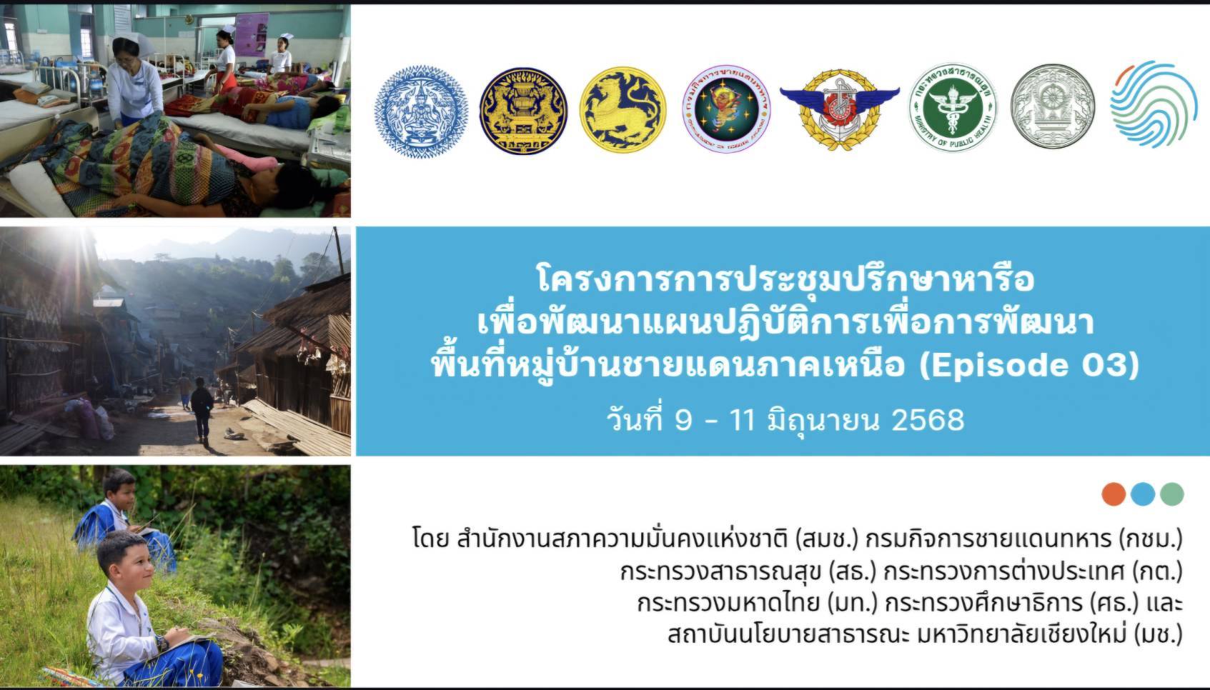 นางฐิติมา เร่งประเสริฐ ศึกษาธิการจังหวัดเชียงราย ร่วมประชุมปรึกษาหารือเพื่อพัฒนานโยบายสาธารณะในพื้นที่หมู่บ้านชายแดนภาคเหนือ เพื่อให้ความช่วยเหลือด้านมนุษยธรรมแก่ประชากรกลุ่มเปราะบาง ตามแนวชายแดนไทย-เมียนมาร์ ด้านการศึกษา และสาธารณสุข ระหว่างวันที่ 9 - 11 มิถุนายน 2568 ณ โรงแรม เบสท์ เวสเทิร์น อำเภอปากเกร็ด จังหวัดนนทบุรี ในการนี้ นางฐิติมา เร่งประเสริฐ ได้ร่วมเสนา เรื่อง การพัฒนาและความท้าทายการพัฒนาพื้นที่ชายแดนด้านสาธารณสุข และการศึกษาในชุมชนของภาครัฐ/ภาควิชาการ และภาคประชาสังคมในฐานะผู้แทนกระทรวงศึกษาธิการ ร่วมกับ ผู้แทนกระทรวงสาธารณสุข กระทรวงการต่างประเทศ