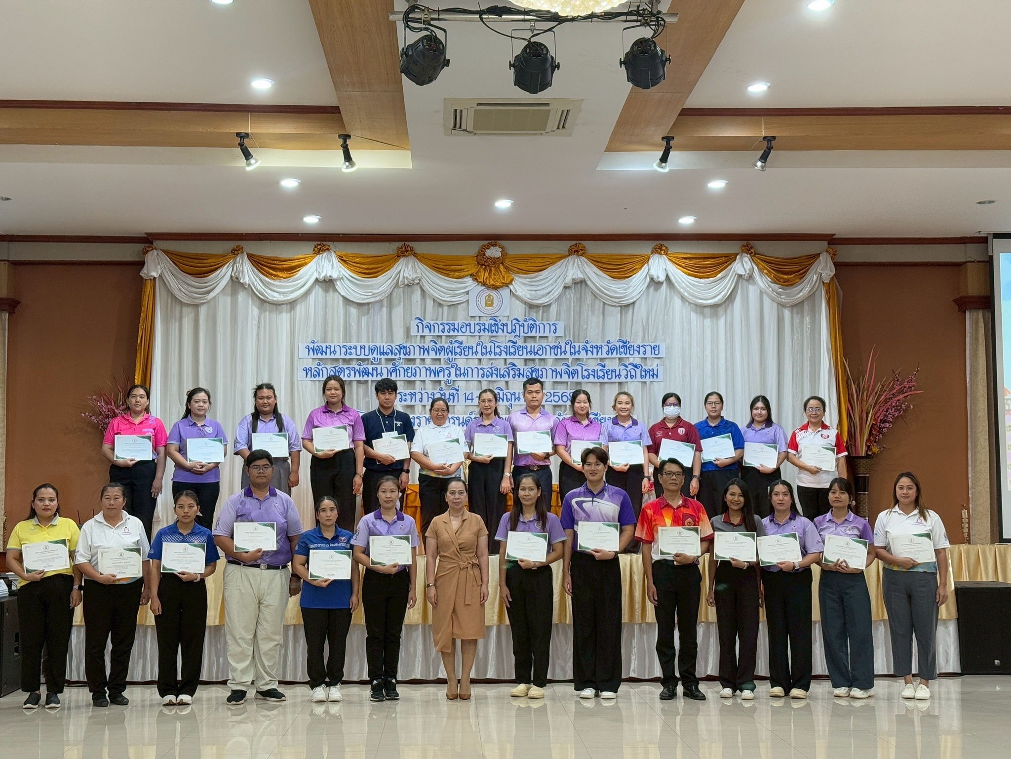 นางฐิติมา เร่งประเสริฐ ศึกษาธิการจังหวัดเชียงราย เป็นประธานเปิดในการอบรมเชิงปฏิบัติการ พัฒนาระบบดูแลสุขภาพจิตผู้เรียนในโรงเรียนเอกชนในจังหวัดเชียงราย หลักสูตรพัฒนาศักยภาพครูในการส่งเสริมสุขภาพจิตโรงเรียนวิถีใหม่ และมอบเกียรติบัตรแก่ครูโรงเรียนเอกชนที่เข้าร่วมการอบรมดังกล่าว ในวันที่ 15 มิถุนายน 2568 โดยมี คณะวิทยากรจากศูนย์สุขภาพจิตที่ 1 เชียงใหม่ จำนวน 5 ท่าน เป็นวิทยากรบรรยายและวิทยากรประจำกลุ่มในการฝึกปฏิบัติเสริมพลังครูเพื่อการปรับพฤติกรรมเด็กวัยเรียนวัยรุ่น ณ โรงแรมเชียงรายแกรนด์รูม อำเภอเมืองเชียงราย จังหวัดเชียงราย