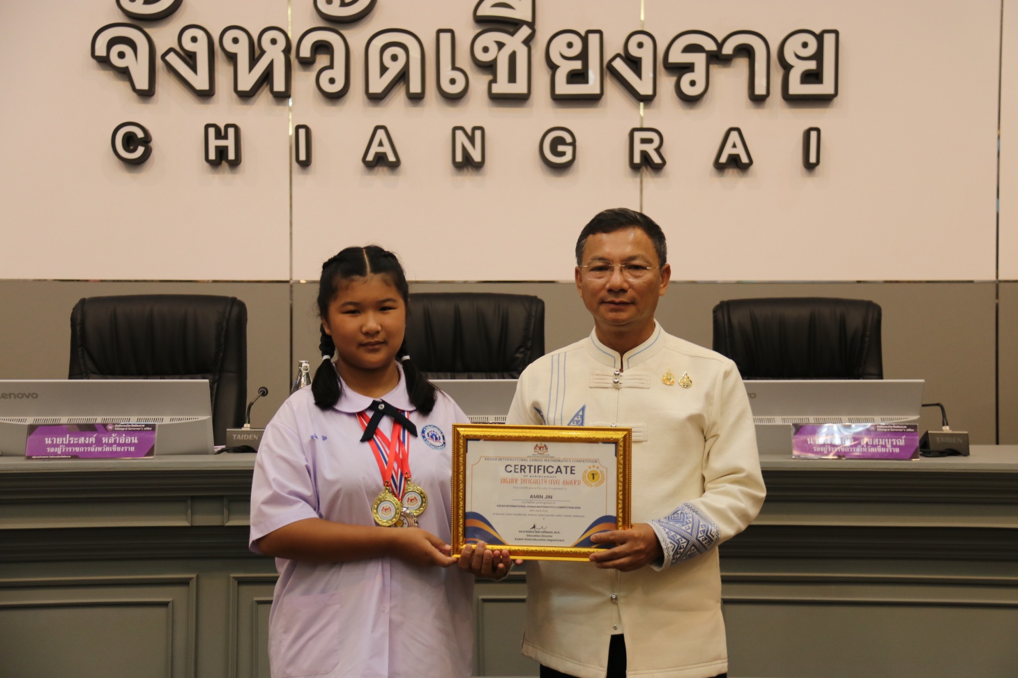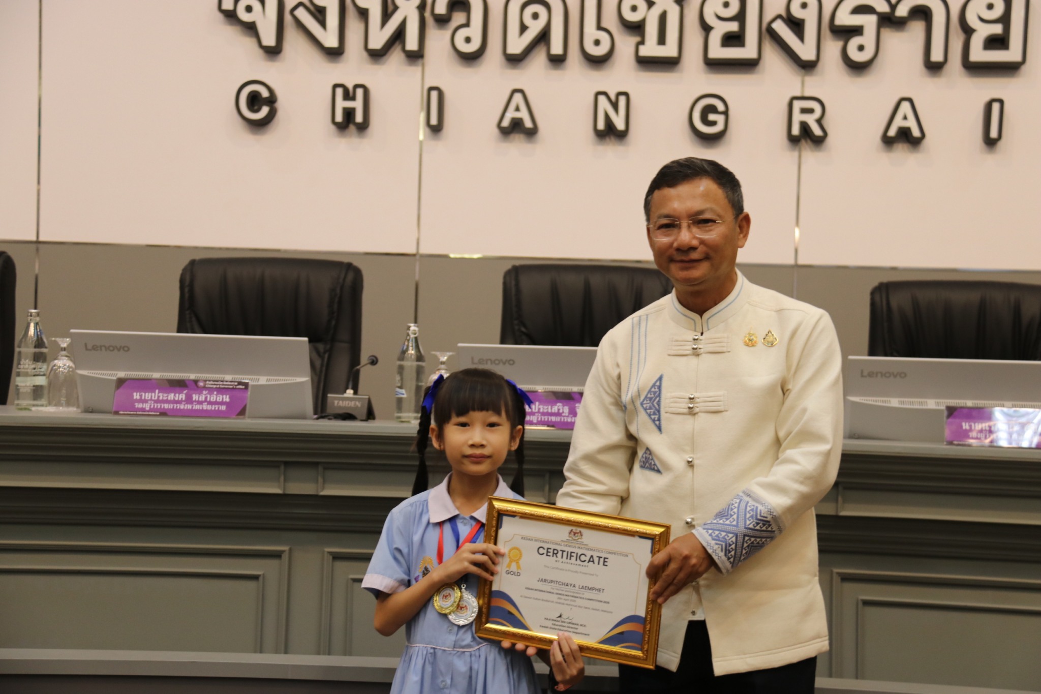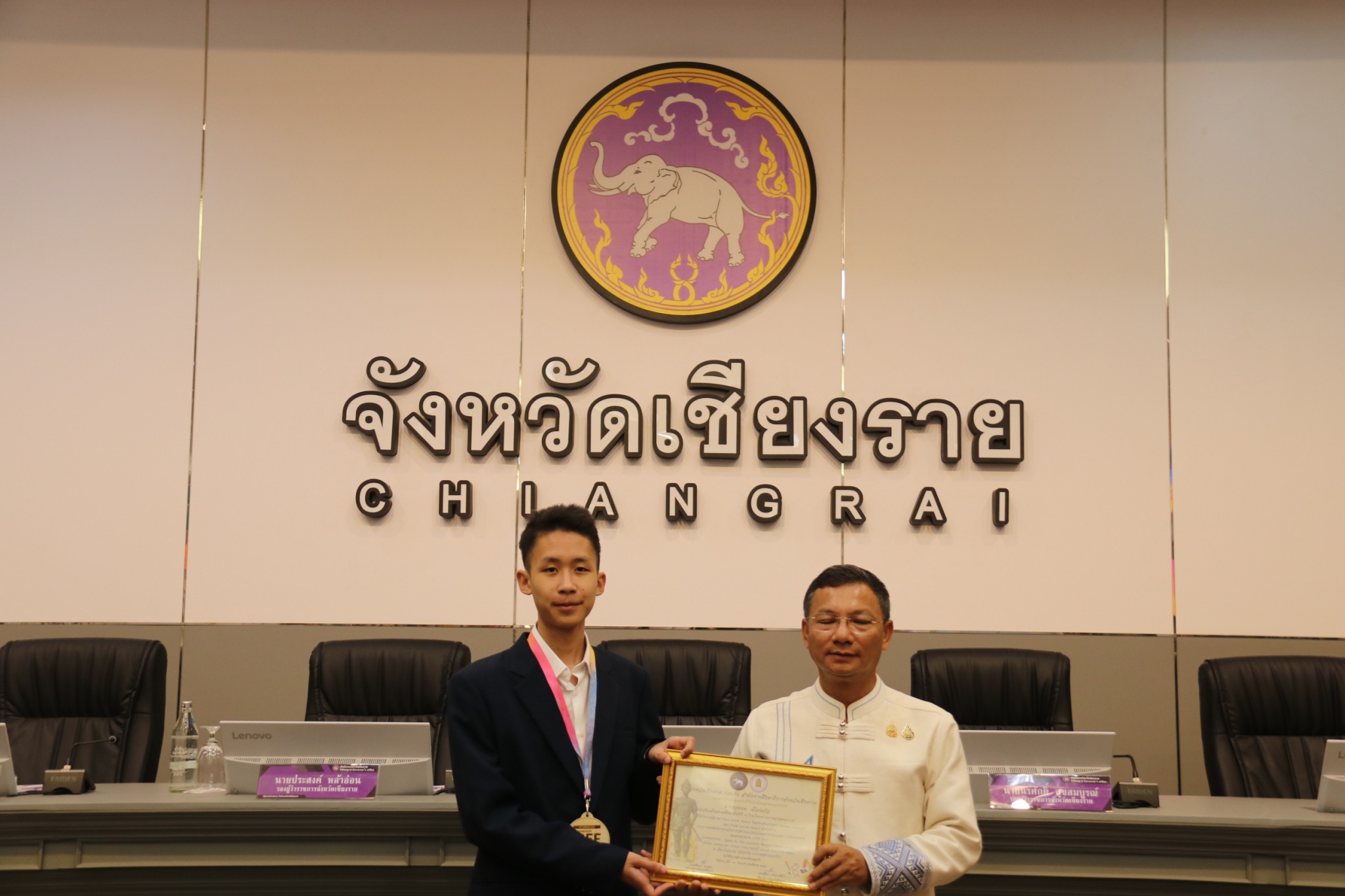 ในการนี้ นางฐิติมา เร่งประเสริฐ ศึกษาธิการจังหวัดเชียงราย มอบหมายให้ พ.จ.ต.ฉลอง อ่อนนวน รองศึกษาธิการจังหวัดเชียงราย นำ ผู้อำนวยการโรงเรียน ครูที่ปรึกษา และนักเรียนเข้ารับเกียรติบัตรและรางวัล ณ ห้องประชุมจอมกิตติศาลากลางจังหวัดเชียงราย