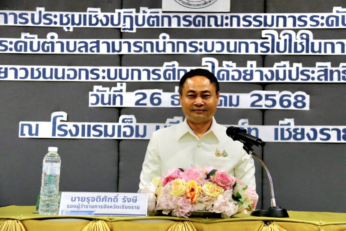 นายรุจติศักดิ์ รังษี รองผู้ว่าราชการจังหวัดเชียงราย เป็นประธานเปิด และนำผู้เข้าร่วมการประชุมถวายความอาลัยแด่สมเด็จพระนางเจ้าสิริกิติ์ พระบรมราชินีนาถ พระบรมราชชนนีพันปีหลวง การประชุมเชิงปฏิบัติการคณะกรรมการระดับตำบล รุ่นที่ 3 โดยมี นางฐิติมา เร่งประเสริฐ ศึกษาธิการจังหวัดเชียงราย กล่าวรายงานวัตถุประสงค์การจัดประชุมฯ ผู้เข้าร่วมประกอบด้วย คณะกรรมการระดับตำบลของ อปท. อ.แม่จัน, อ.แม่สาย, อ.ดอยหลวง, อ.แม่ฟ้าหลวง จำนวน 150 คน ภายใต้โครงการสนับสนุนคณะทำงานจังหวัดเพื่อพัฒนากลไกขับเคลื่อนการแก้ไขปัญหาเด็กและเยาวชนนอกระบบการศึกษาให้กลายเป็นศูนย์ สำนักงานศึกษาธิการจังหวัดเชียงราย (TZD จังหวัดเชียงราย) เพื่อให้คณะกรรมการขับเคลื่อนการแก้ไขปัญหาเด็กและเยาวชนนอกระบบการศึกษาให้กลายเป็นศูนย์ (Thailand Zero Dropout) ระดับจังหวัด สามารถปฏิบัติหน้าที่เป็นกลไกหลักในการขับเคลื่อนการแก้ไข ปัญหาเด็กและเยาวชนนอกระบบการศึกษาของจังหวัด ประสานงาน ส่งเสริม และสนับสนุนให้เกิดคณะกรรมการขับเคลื่อนการแก้ไขปัญหาเด็กและเยาวชนนอกระบบการศึกษาให้กลายเป็นศูนย์ (Thailand Zero Dropout) ระดับพื้นที่ (อำเภอและ/หรือ รวมถึงบูรณาการข้อมูล การค้นหา ช่วยเหลือ ดูแล และส่งต่อผ่านระบบสารสนเทศ Thailand Zero Dropout ให้เด็กและเยาวขนนอกระบบการศึกษาเข้าสู่ระบบการศึกษา เรียนรู้ และพัฒนาตนเองได้สอดคล้องกับศักยภาพ