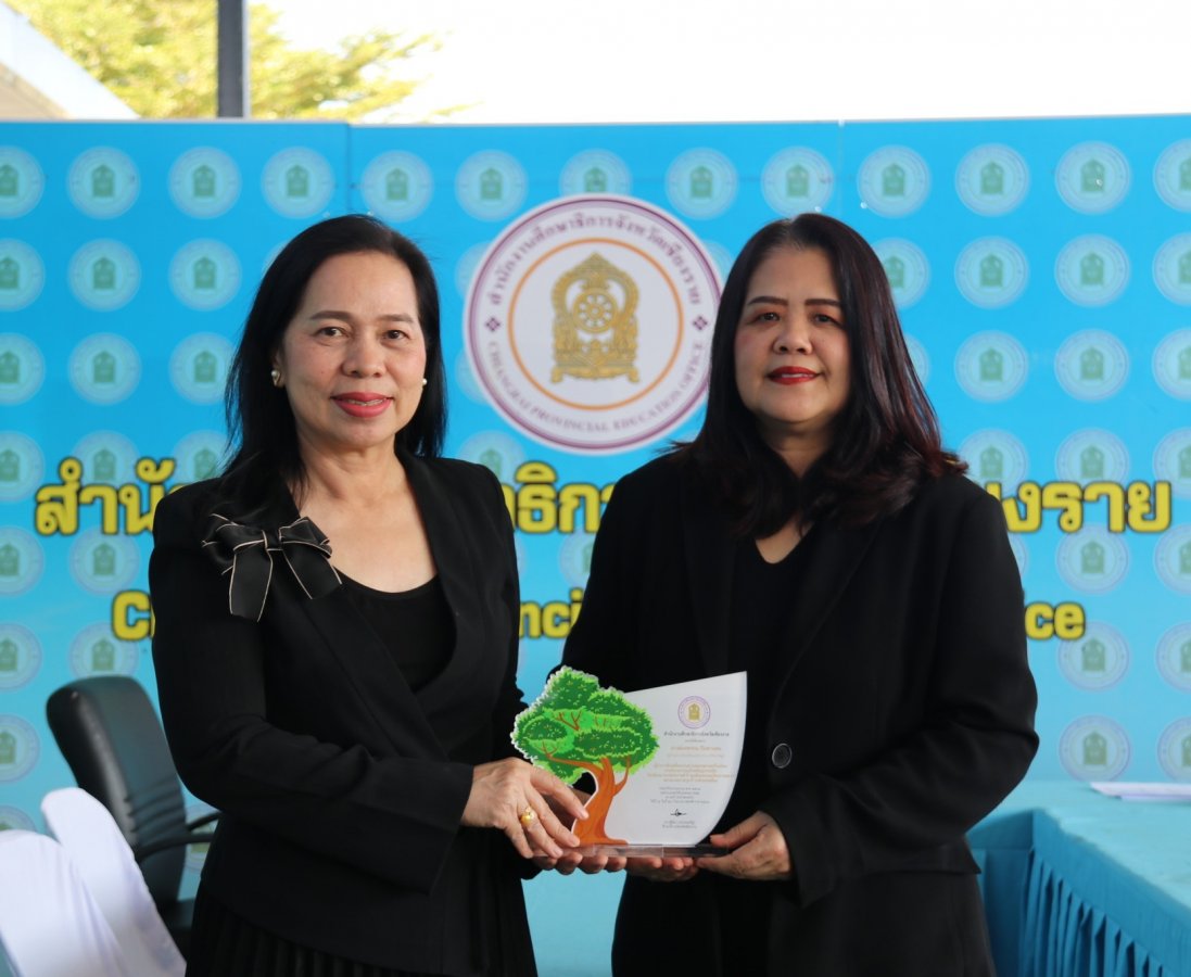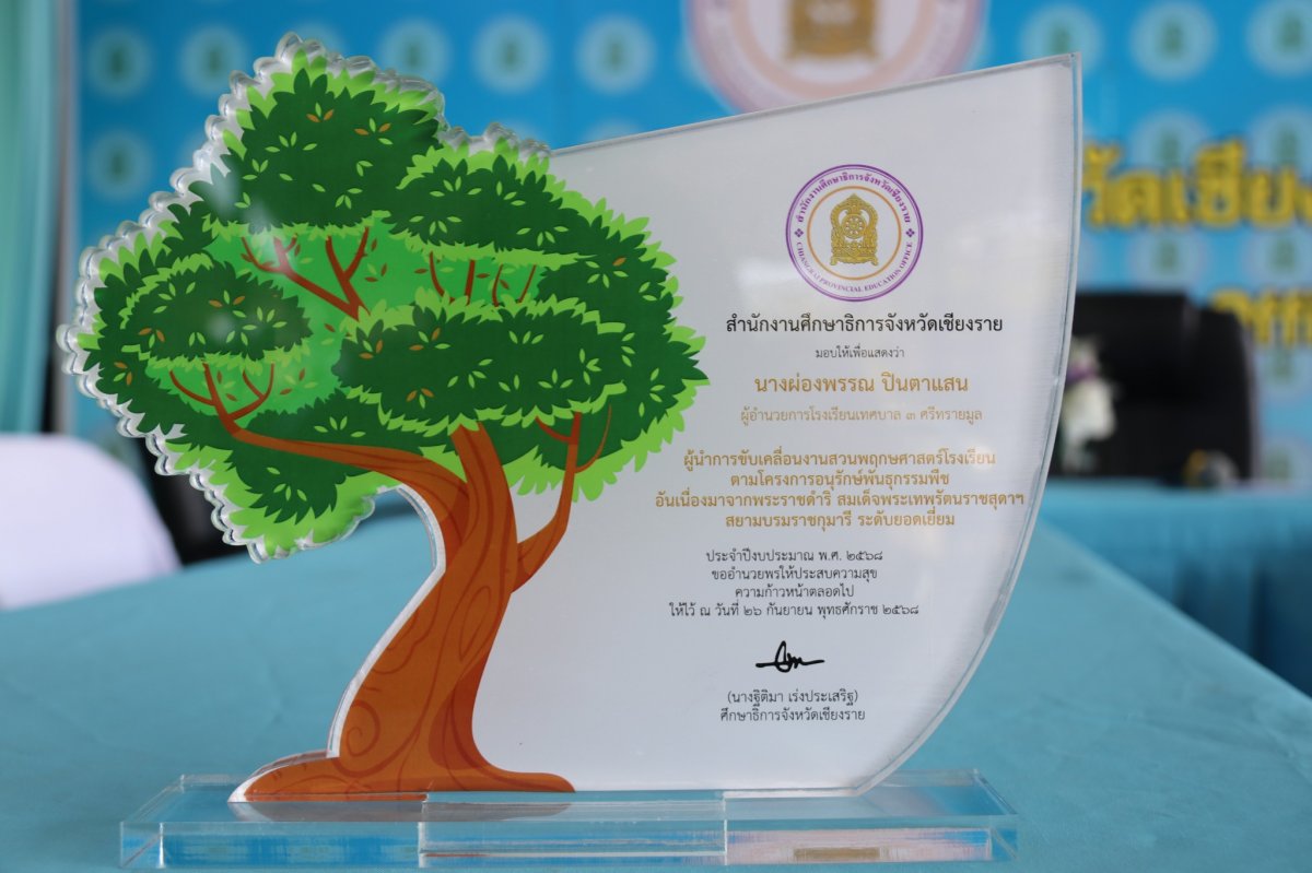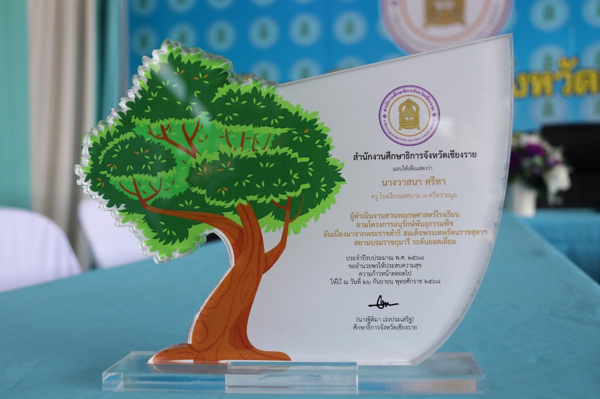 วันที่ 5 มกราคม 2568 นางฐิติมา เร่งประเสริฐ ศึกษาธิการจังหวัดเชียงราย มอบโล่รางวัลผู้ดำเนินงานสวนพฤกษศาสตร์โรงเรียน ตามโครงการอนุรักษ์พันธุกรรมพืชอันเนื่องมาจากพระราชดำริ สมเด็จพระเทพรัตนราชสุดา สยามบรมราชกุมารี ระดับยอดเยี่ยม ประจำปีงบประมาณ พ.ศ.2568 ให้แก่ โรงเรียนเทศบาล 3 ศรีทรายมูล สังกัดเทศบาลนครเชียงราย แด่ นางผ่องพรรณ ปินตาแสน (ผู้บริหารสถานศึกษา) นางวาสนา ศรีทา และ นางสาวจุฑามาศ วงค์เครือใต้, (ครูผู้รับผิดชอบโครงการ) ณ สำนักงานศึกษาธิการจังหวัดเชียงราย อ.เมืองเชียงราย จ.เชียงราย ศธจ.เชียงราย สำนักงานประชาสัมพันธ์จังหวัดเชียงราย